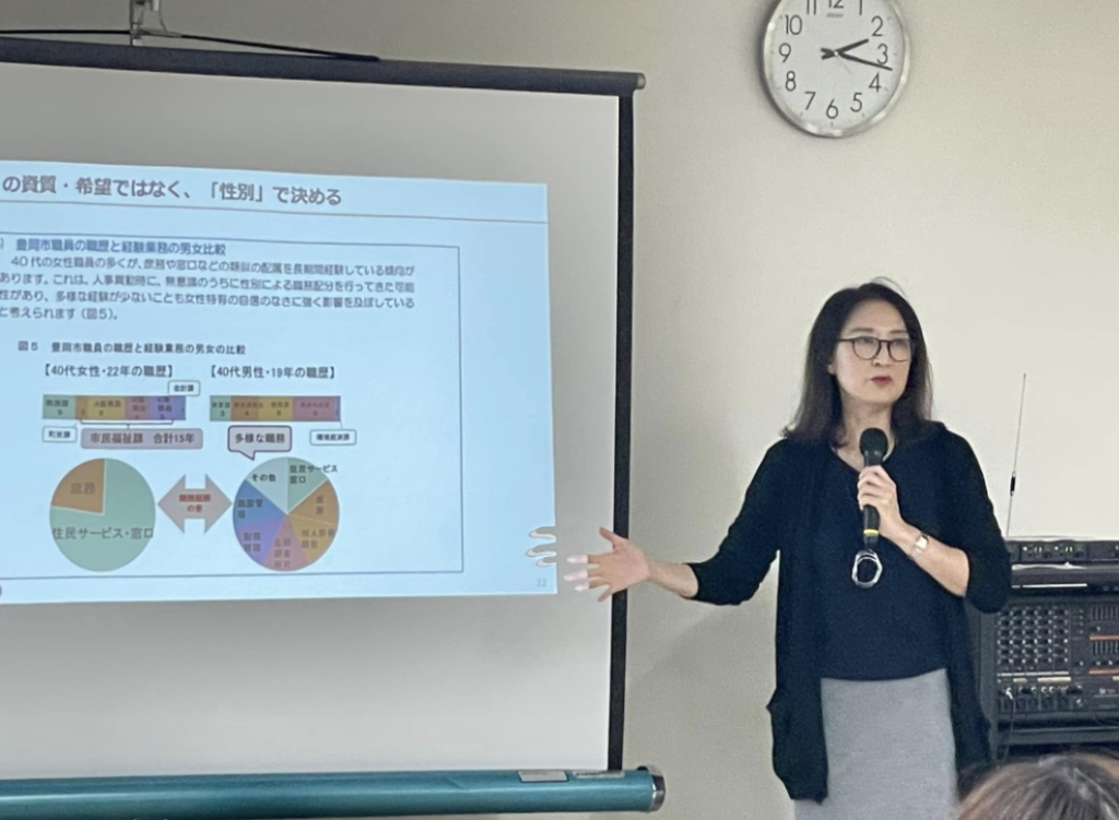 まず、「ジェンダー」とは、男性らしさ・女性らしさから社会的・文化的に作られた性別で、日本の「意思決定は男性、従うのは女性」などの意識は、戦後の高度経済成長期に「強化」された性別役割分担意識であること、「性別役割分業」が構造化され、それを前提とした社会・経済が構築されていることを学んでいきます。